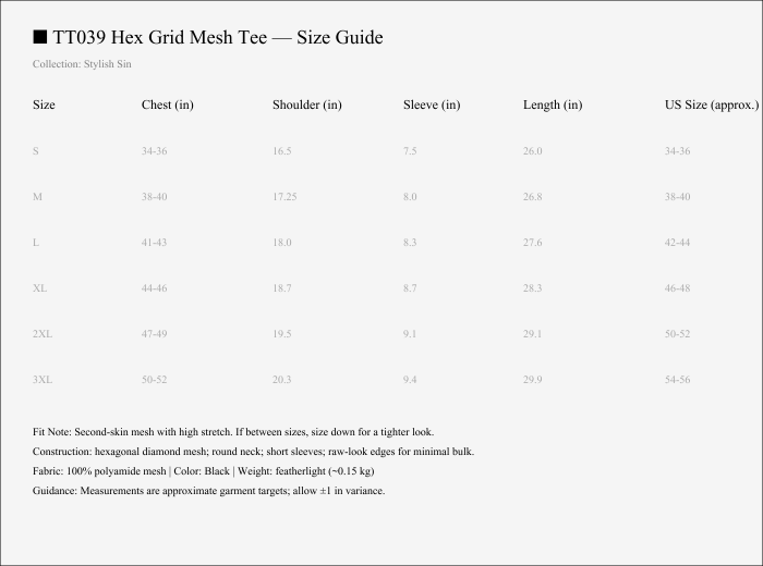 Clean-cut menace with X-ray attitude. Hex Grid Mesh Tee is a short-sleeve, round-neck top cut from elastic hexagonal netting that clings, breathes, and broadcasts your silhouette. Minimal seams. Maximum signal. Layer it over harnesses, under vests, or wear it pure—just mesh and intention.